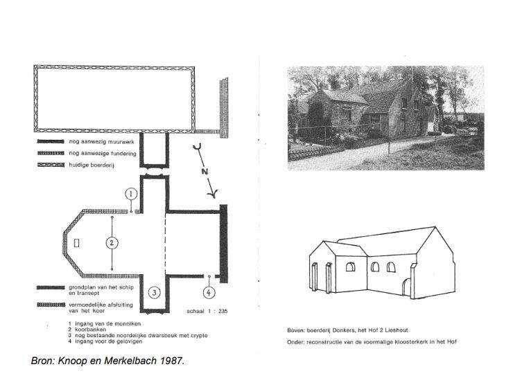 De kerk op “t Hof was een kruiskerk. Bij een kruiskerk heeft de plattegrond een kruisvorm door de aanwezigheid van twee dwarsbeuken, ook wel transept genoemd. Er werd een crypte aangebracht onder de noordelijke dwarsbeuk van het transept. Dit deel, nu een onderdeel van de boerderij die vanuit hier te zien is, is het enige zichtbare overblijfsel van de kloosterkerk van Boudewijn. De tekening laat zien hoe de kerk er uit zag. Ze werd in 1648 overgenomen door de hervormden, maar aangezien de Hervorming in Lieshout geen aanhang had, bleef de kerk in ’t Hof sindsdien leeg . De kerk werd nooit meer gebruikt en reparaties hadden dan ook vrijwel niet plaats. De kerk raakte in verval. Vanuit hier was de robuuste Kempische toren te zien. Deze werd lange tijd gebruikt als officiële gevangenis en kreeg in 1773 nog een opknapbeurt en een nieuwe spits. Tijdens een zware storm op 9 november 1800, begaf de torenspits het en de muren van de oude kerk stortten in. De alleenstaande toren had het geweld redelijk goed doorstaan, maar werd in 1836 afgebroken.