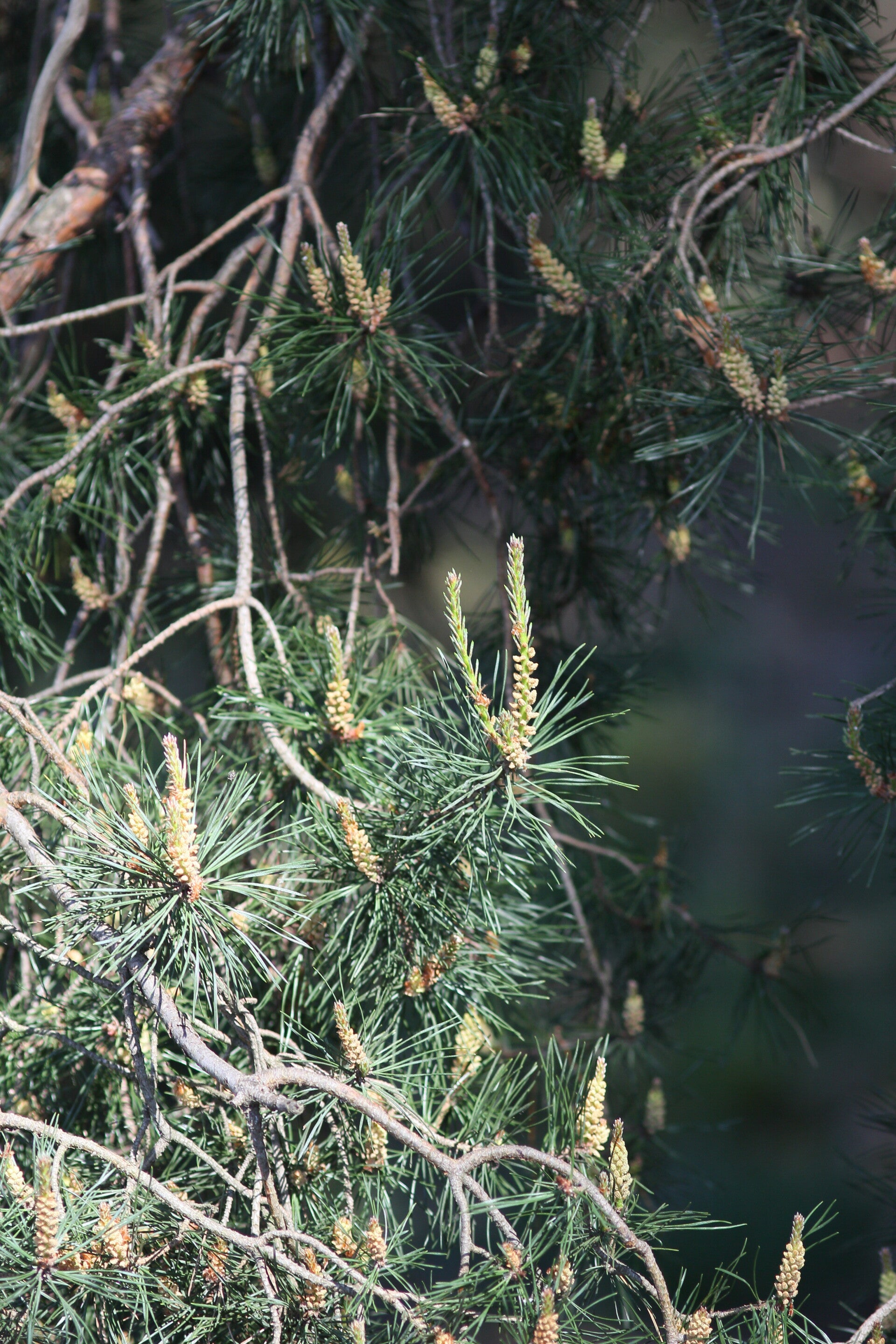 Kroon:in jeugd piramidaal, later parasolvormig, halfopen kroon, grillig groeiend, Schors en takken:oude schors grijsbruin, in grove stroken, bovenin oranjebruin Blad:naalden 2 bijeen, stijf, blauwgroen, licht gedraaid, 3 - 6 cm, groenblijvend